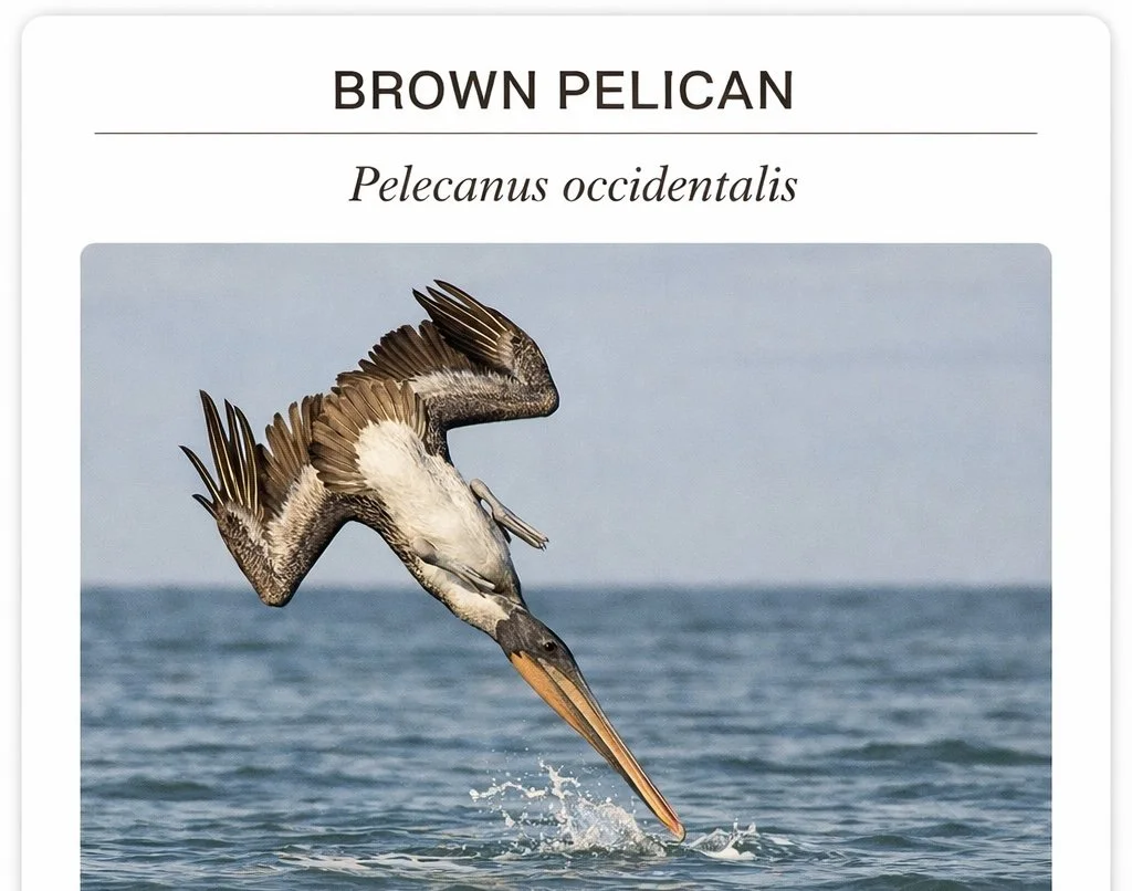 Field Notes from Hunting Island · Beach & Surf · Mid-Morning There is no warning. One moment it's gliding — that prehistoric silhouette coasting on a thermal, wings barely moving, riding the air column off the water's surface. And then something shifts. The head angles down. The wings fold back. And the whole bird becomes a spear. It isn't graceful in the way people mean when they call birds graceful. It's precise. It's committed. It's forty miles per hour straight into the Atlantic. The first time I watched a brown pelican dive I actually flinched. The speed of it. The commitment. From full glide to full plunge in what felt like a single frame — hitting the surface with a force you can hear from thirty feet away. What the pelican has that makes this survivable is extraordinary anatomy. Air sacs beneath the skin of its chest and throat inflate on impact, cushioning the collision. Its bill snaps shut around the fish, and the expandable pouch — which can hold three times more than its stomach — strains the water out while holding the catch. The whole sequence, from plunge to surface, takes about a second. Brown pelicans nearly vanished in the 1970s. DDT was thinning their eggshells to the point of collapse — the weight of a nesting parent was enough to crush them. The species was on the endangered list until 2009. Every pelican gliding over Hunting Island today is a recovery story, whether it knows it or not.